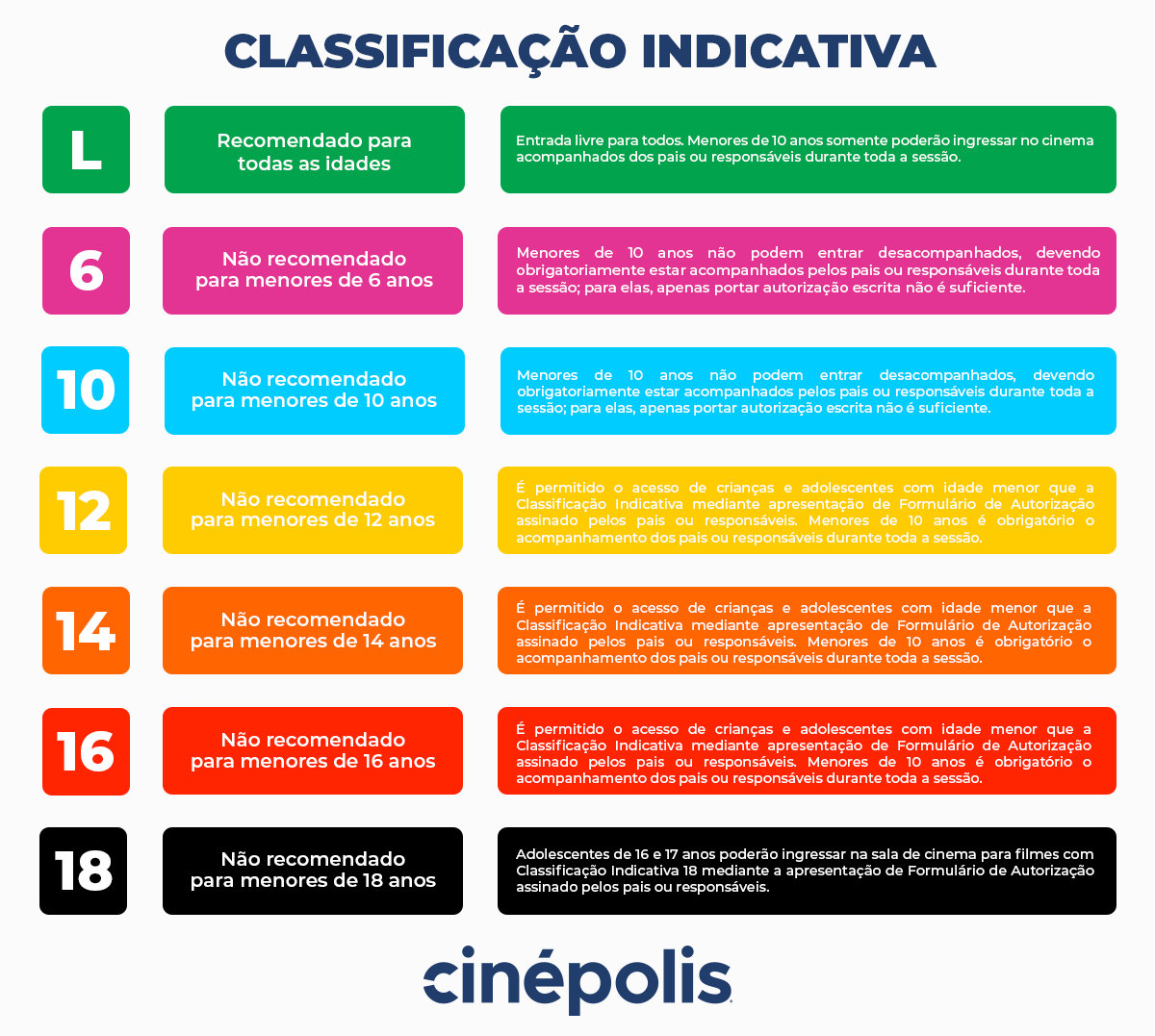 - Em virtude da Lei Geral de Proteção de Dados, os pais/responsáveis que desejem autorizar menores a ingressar em filmes cuja classificação seja superior à sua idade, automaticamente autorizarão a Cinépolis a guardar seus dados pessoais e do(s) menor(es).